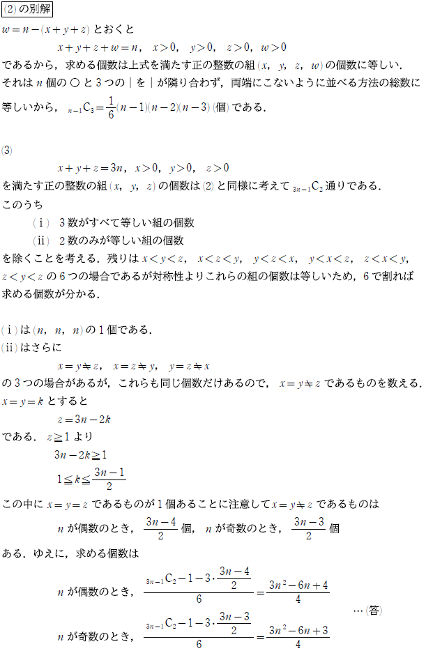(1)が(2)への誘導のつもりだとは思いますが、むしろ場合の数の考え方で解いてしまった方が楽です。(3)も普通に考えるだけです。多数の類題がある問題のため、できれば完答しておきたい問題です。ただし、最後は場合分けがいるなど細かい部分にも注意が必要です。
